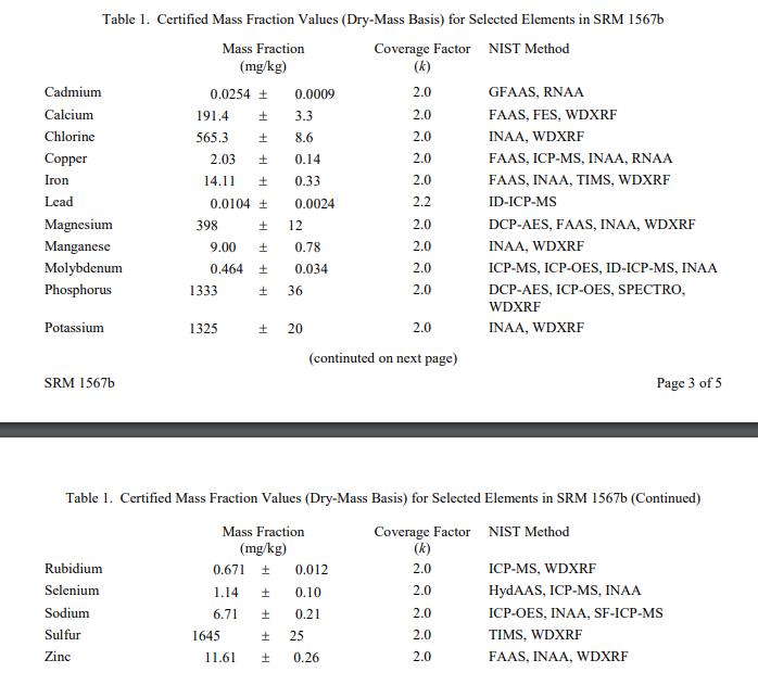表 1 提供了 SRM 1567b 中選定元素的認(rèn)證質(zhì)量分?jǐn)?shù)值。 NIST 認(rèn)證值是 NIST 對其準(zhǔn)確性的最高置信度的值,因為所有已知或可疑的偏差來源都已調(diào)查或考慮[1]。以質(zhì)量分?jǐn)?shù)單位 [2] 以干質(zhì)量為基礎(chǔ)報告值。