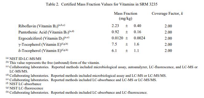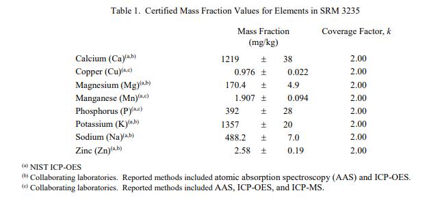 表 1 和表 2 提供了 SRM 3235 中元素和維生素的認(rèn)證質(zhì)量分?jǐn)?shù)值,按原樣報(bào)告,在表 1 和表 2 中提供。 NIST 認(rèn)證值是 NIST 對(duì)其最有信心的值準(zhǔn)確性,因?yàn)樗幸阎蚩梢傻钠顏碓炊家驯徽{(diào)查或考慮到[1]。價(jià)值分配分析由 NIST 和合作實(shí)驗(yàn)室進(jìn)行。
